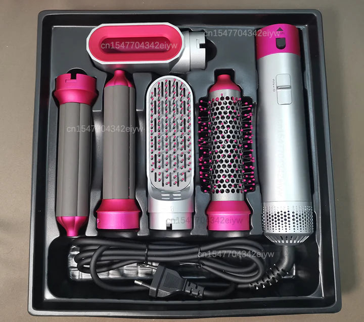 Nuestro cepillo de aire caliente viene con cinco accesorios intercambiables que hacen que alisar, rizar, dar volumen y masajear el cuero cabelludo sea un sueño.