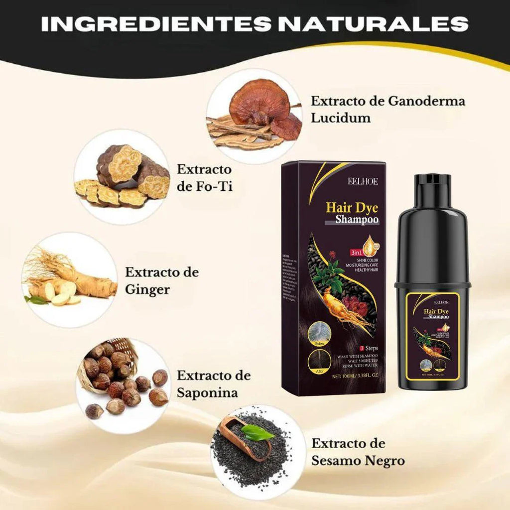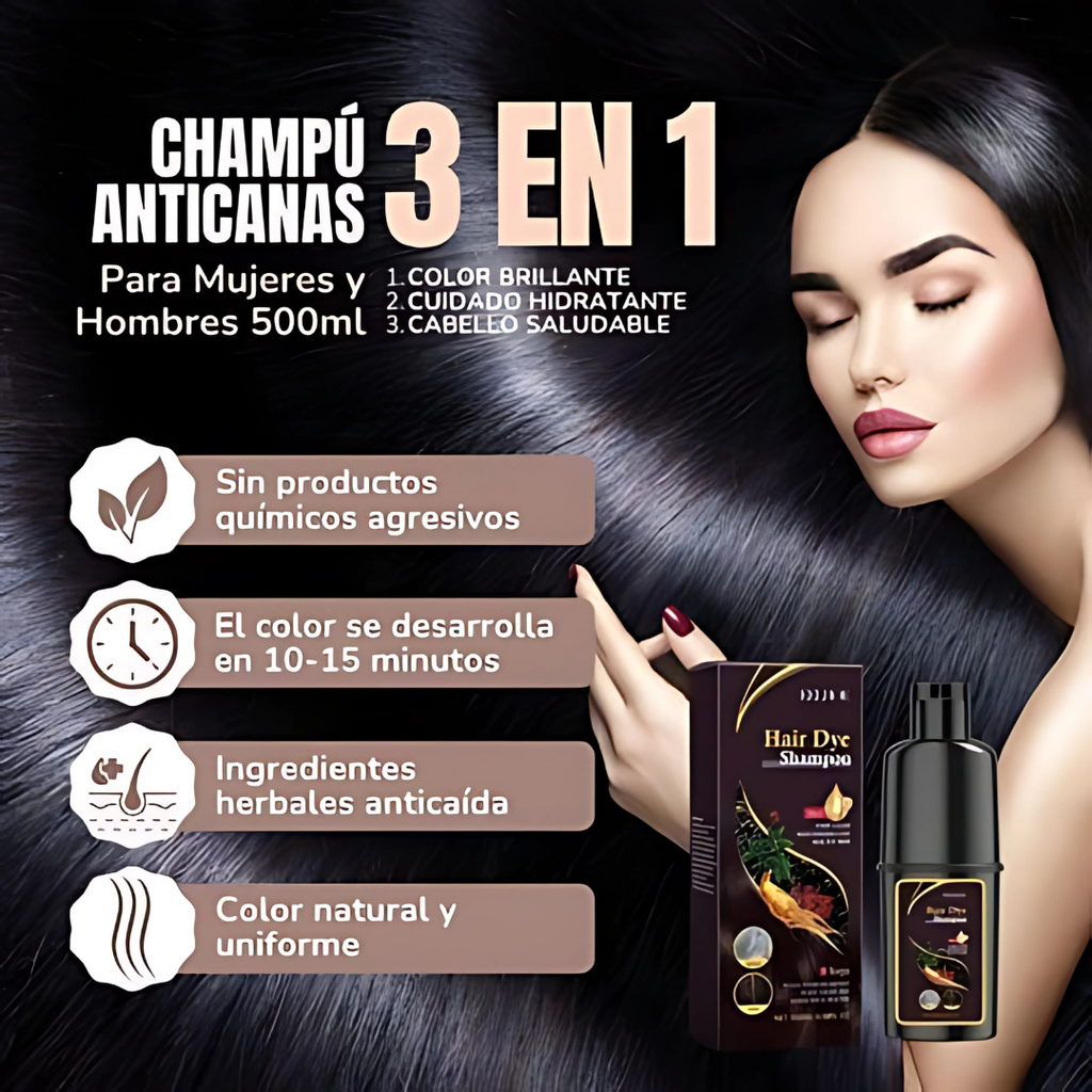 Los tintes convencionales están llenos de químicos que debilitan el cuero cabelludo, generan picor, mal olor y requieren horas de aplicación. ¿Y lo peor? Tienes que volver a usarlos cada pocas semanas. Nuestro champú es diferente: lava, nutre y tiñe suavemente tu cabello en un solo paso, sin olor, sin manchas y sin dañar tu piel. Una solución rápida, cómoda y 100% en casa.